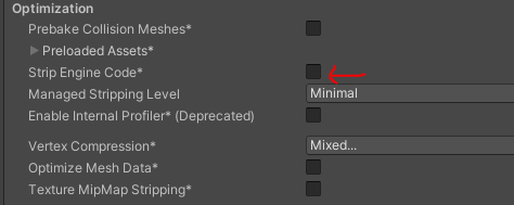 e/unity: could not produce class with id 137. this could be caused by a class being stripped from the build even though it is needed. try disabling 'strip engine code' in player settings.